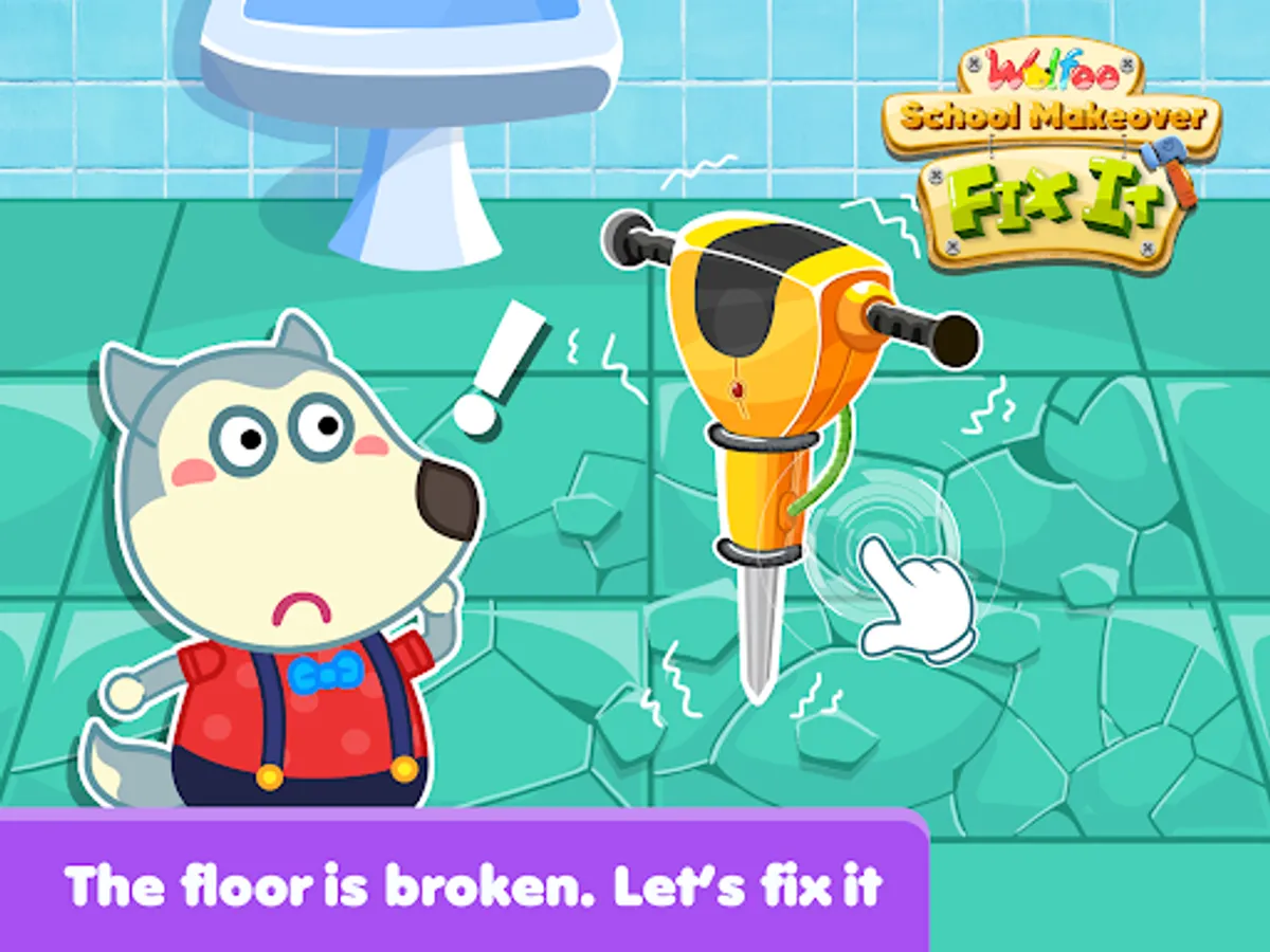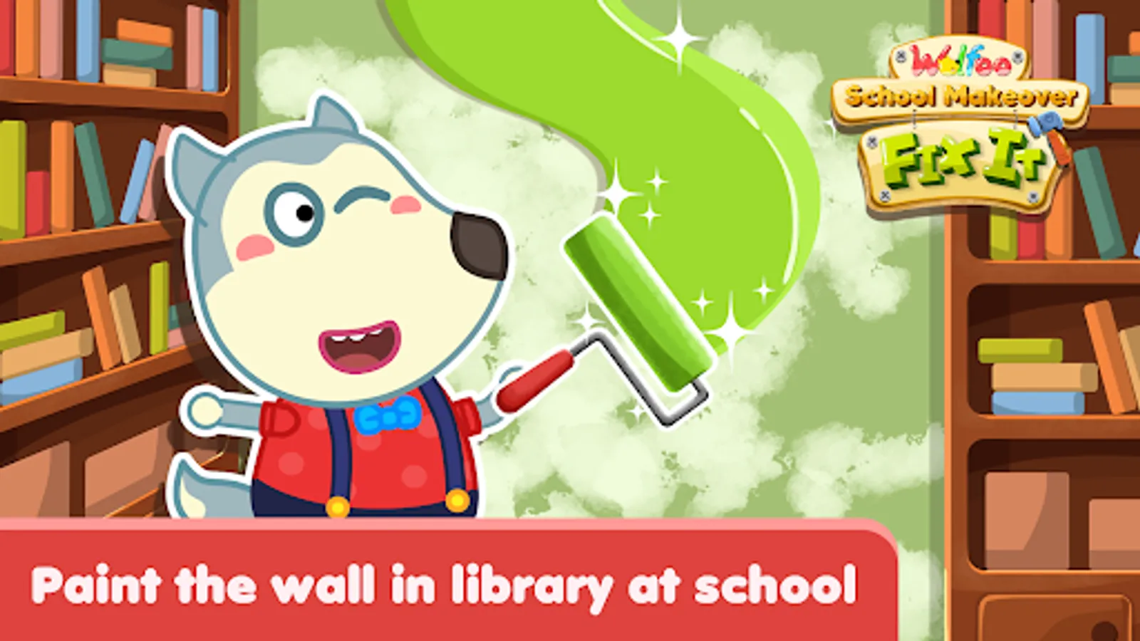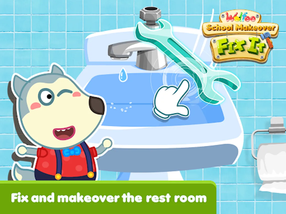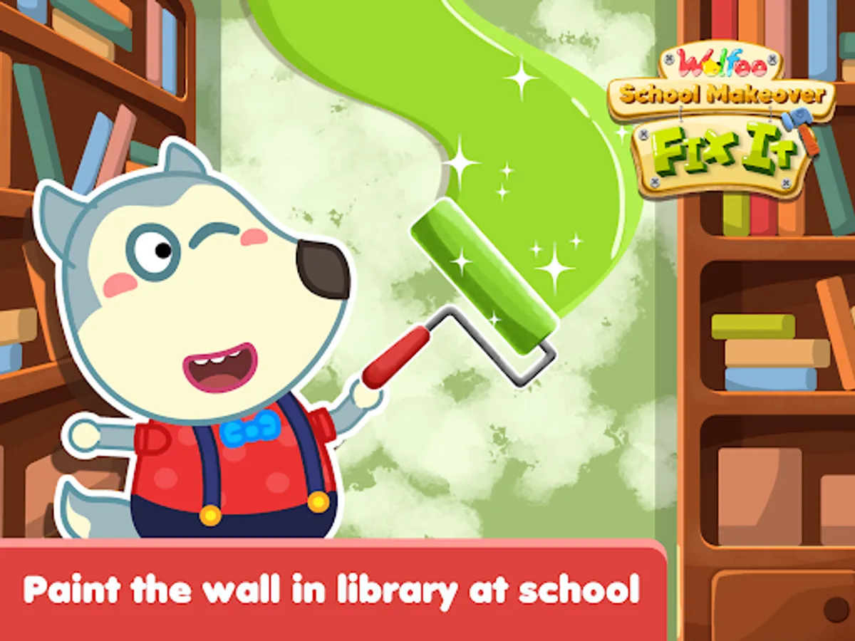Let's fix the wall in library, then paint it, make it beautiful again. Secondly, there are some rooms that needed to be cleanup and makeover, such as: restroom, kitchen, bed room. So many things that are broken, you have to repair them, fixit. In addition, there are some outdoor repairing activities in campus for you to try. Come on, make Wolfoo's school clean and neat.
