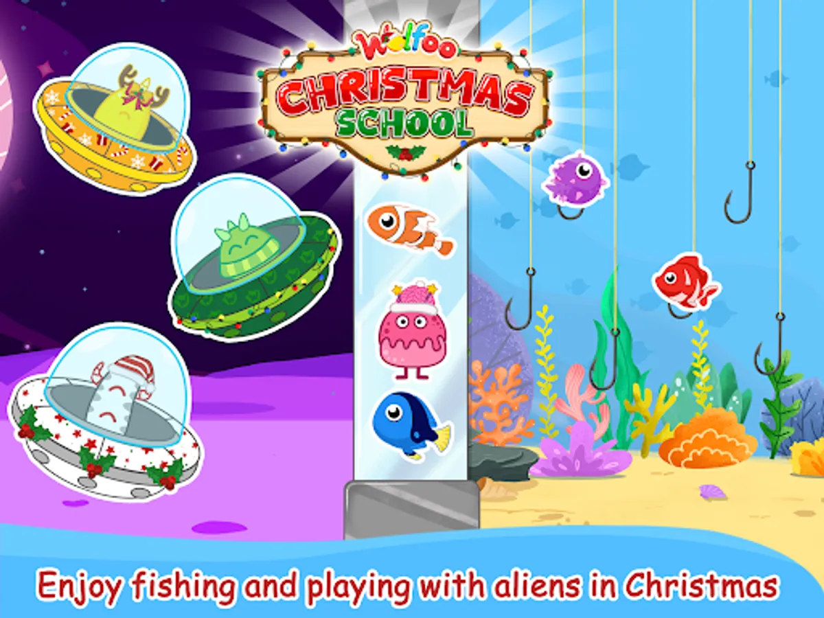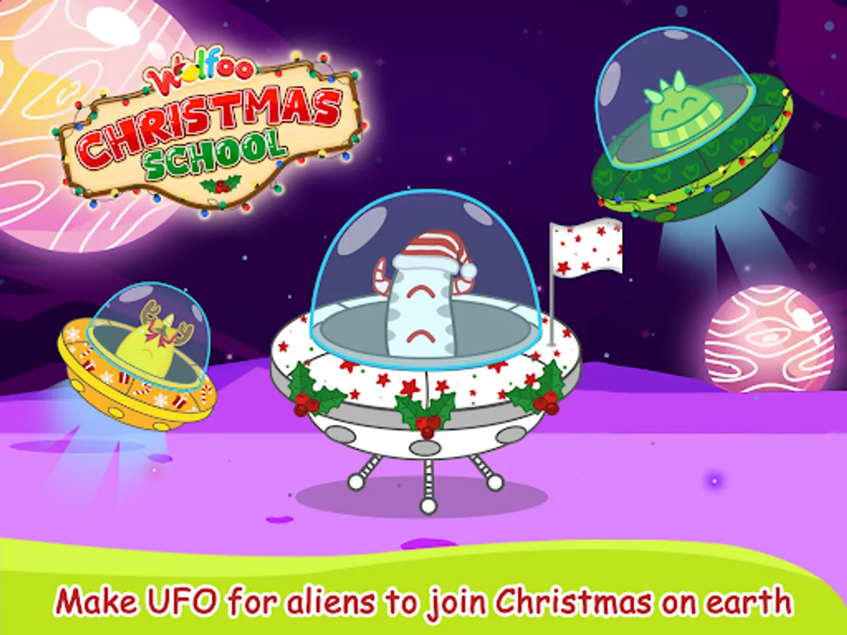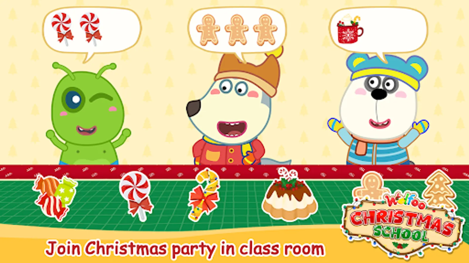 Santa Wolfoo drive the sleigh to collect toys and candy canes on his way. Let's join this amazing adventure on christmas night. The excited and surprise part of Xmas is gift unboxing. So Wolfoo and friends will decorate class room and prepare many gifts for everyone. That's very fun and meaningful activity at school before Christmas. We all have a Christmas holiday, what about the aliens, yes they have a great holiday too. That's why we are going to play with the cute reindeer aliens out of space at Christmas night. The second surpise part of this Christmas game is a Noel party for Wolfoo, friends, and teachers. There are a lot of yummy food, fruits, drinks to taste and enjoy cozy atmosphere of holiday. Fridge is an important things for winter, especially Christmas. So let's hep Wolfoo decorate the fridge and fill it by delicious gingerbread cookies, cupcakes, candy canes, many other food and drinks.