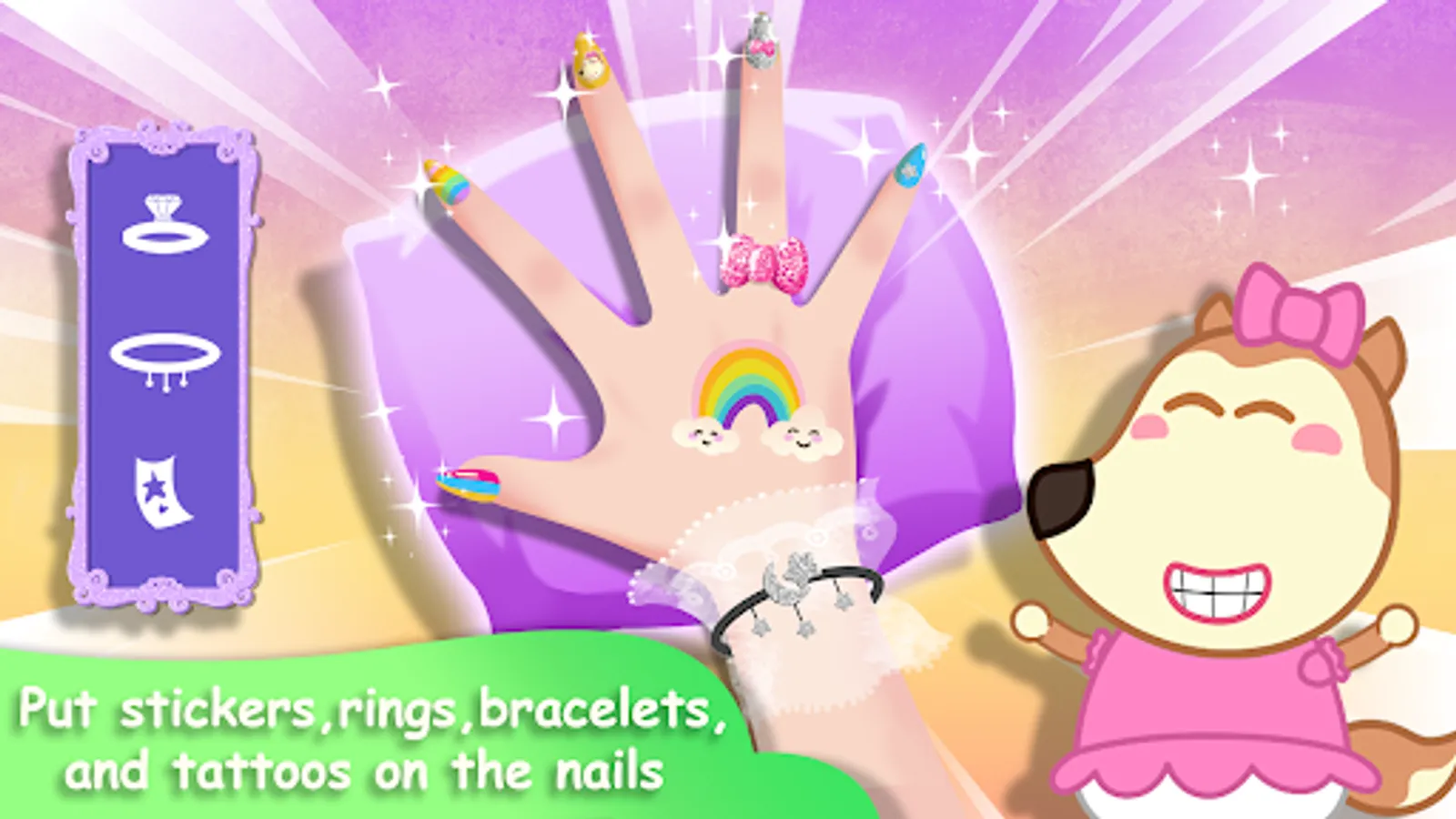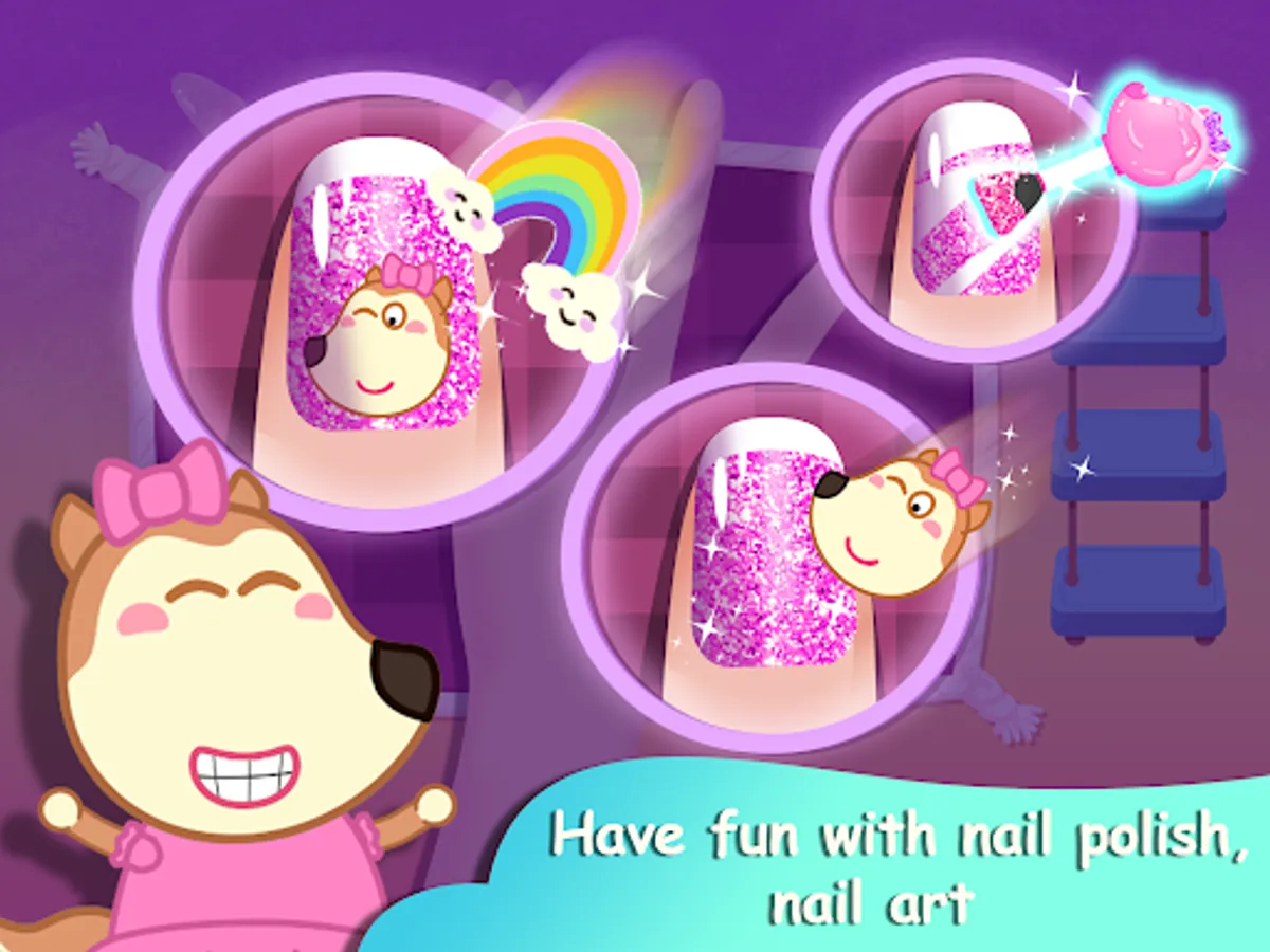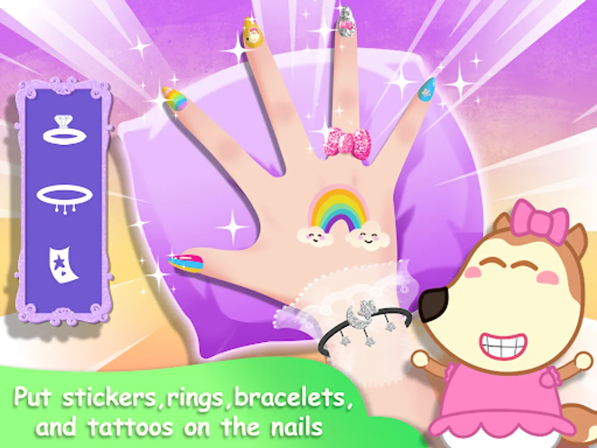 So let's come to nail salon of Lucy to clean your hands, make pretty nail's shapes by nail nipper, paint the nail art, enjoy colorful collection of nails polish, then put some cute and beautiful stickers on the nails. You can pick some rings, bracelets to wear. Let's download this nail game for girls to enjoy now
