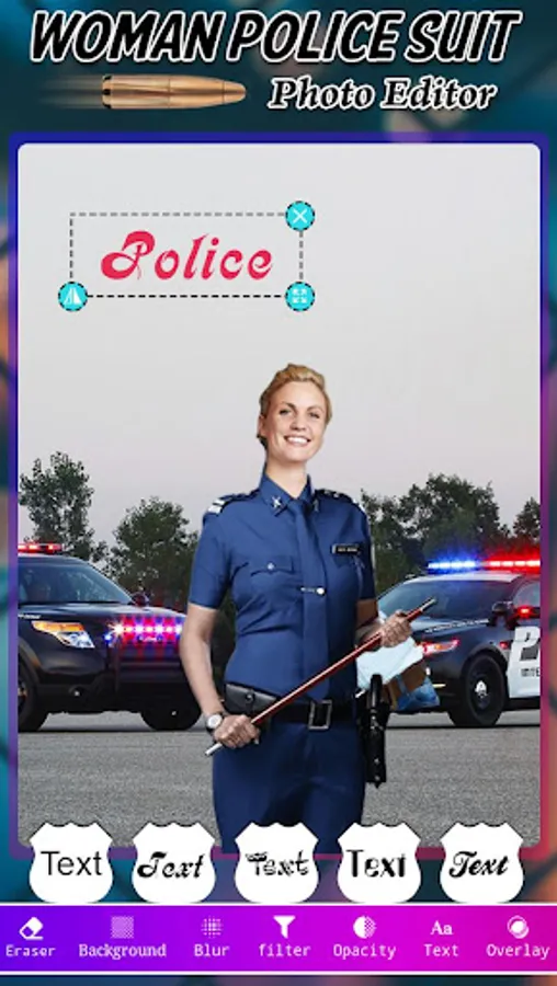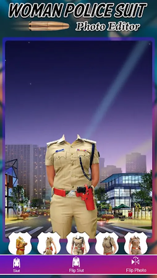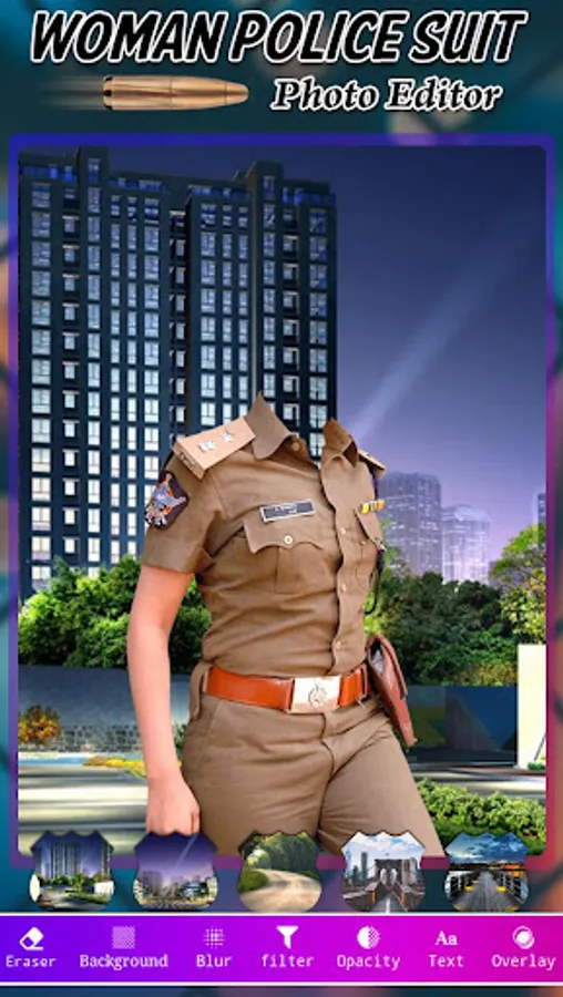 Select Suit and select photo from gallery and cut photo and set photo into suit and eraser selected photo and suit and set background, add stickers. Woman Police Photo Suit app provide different type of police women photo suits with different suit and size and check how you will look with an policy women suit clothes on??