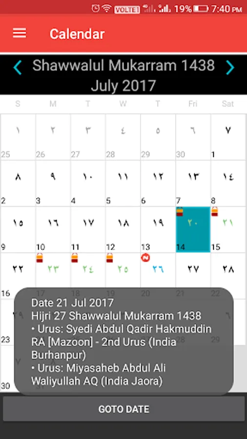 * Monthly Hijri & Georgian Calendar with Miqaat, FMB & Niyaz Icons with Menus
