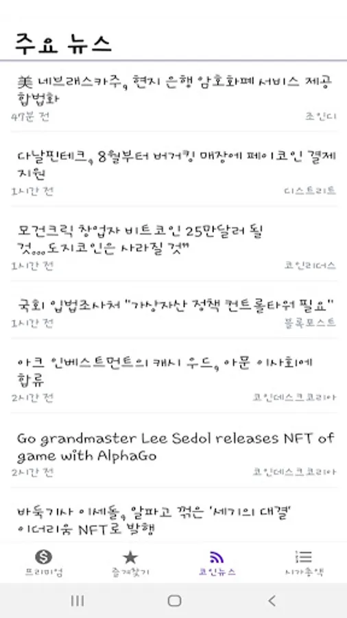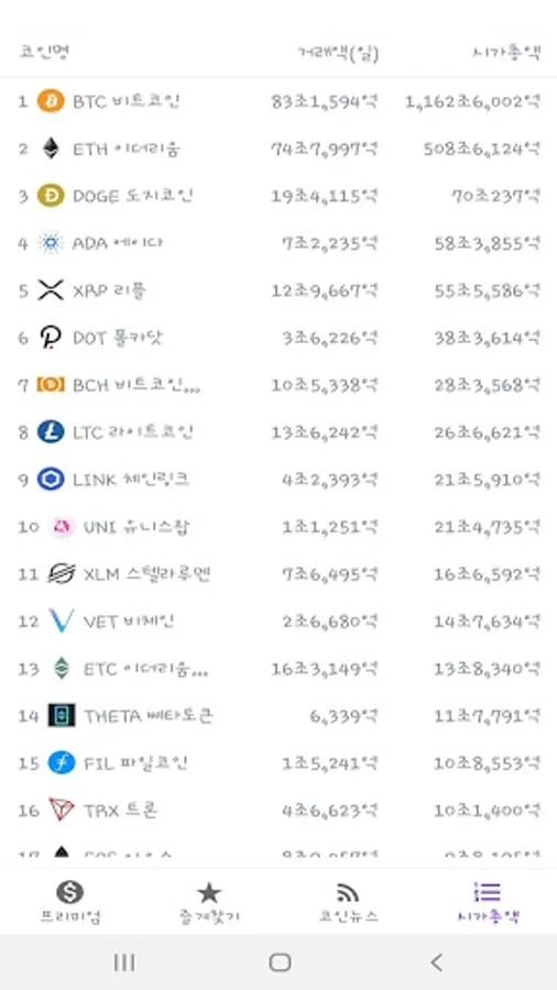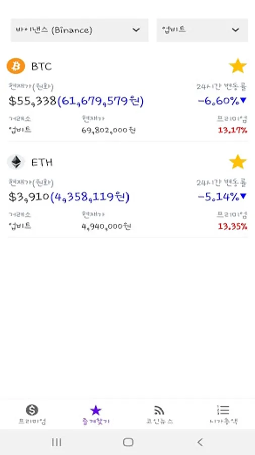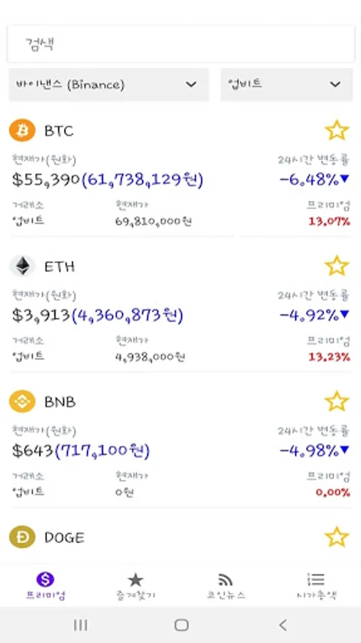 You can easily check virtual currency (Bitcoin, Ethereum, Dogecoin, Ripple, etc.) premium, coin news, and market cap.