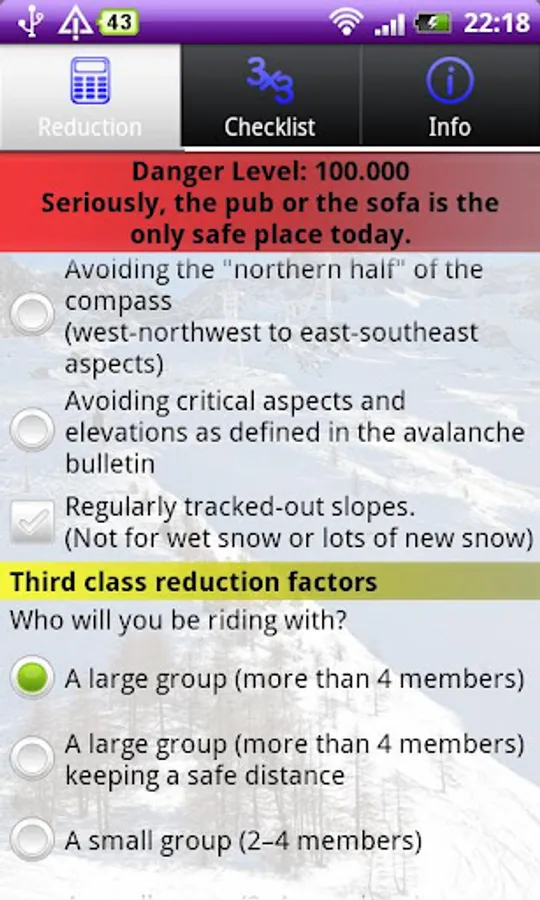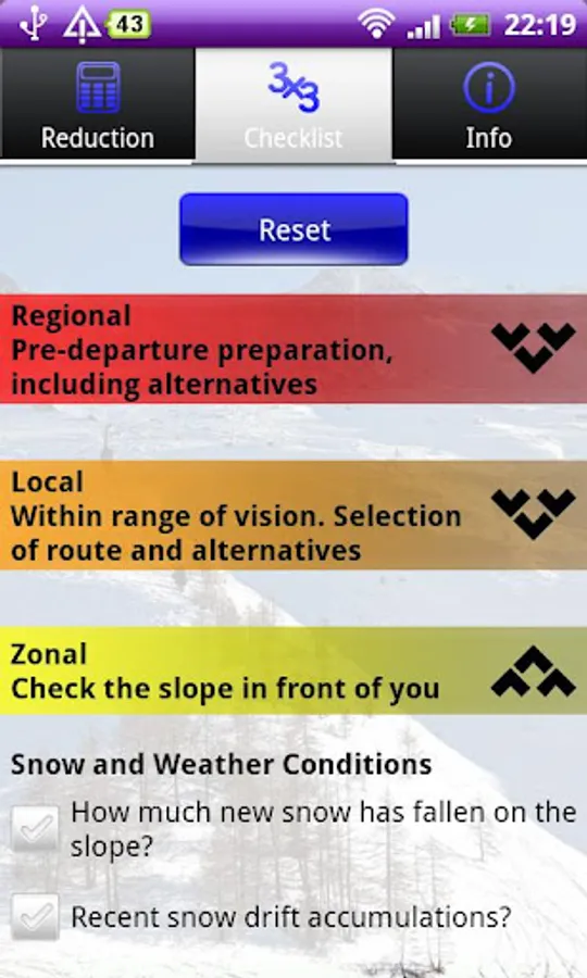 1. A screen that helps to calculate the avalanche risk, based on the avalanche report, using the Reduction Method developed by Swiss avalanche expert Werner Munter.
