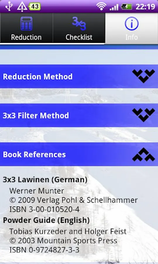 This app is designed to be used in conjunction with other sources for weather and avalanche forecasts. These can be accessed through the internet, MMS services, television, newspapers, official bulletins and other region specific phone apps.