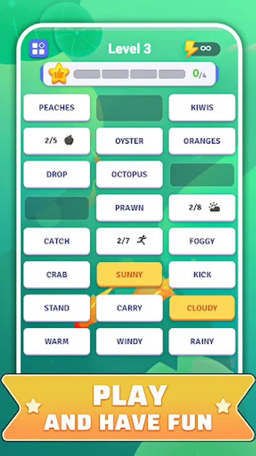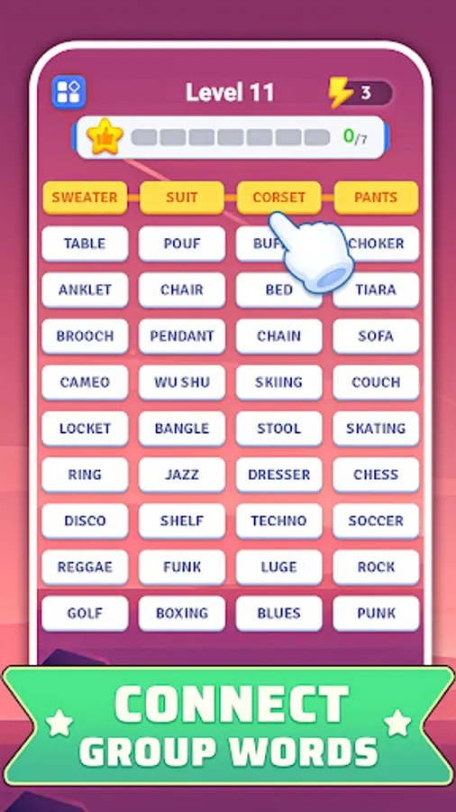 Word association game requires iassociate players to accomplish association puzzle objectives through various association word gameplay mechanics such as word categorization, connecting and merging, and iassociate challenges. Unlike traditional word search games, word association game needs to skillfully connect and eliminate words of the same associations juego de palabras theme by swiping your finger. As the difficulty of word association games increases, the vocabulary categories in the association puzzle become more complex, adding a delightful challenge.