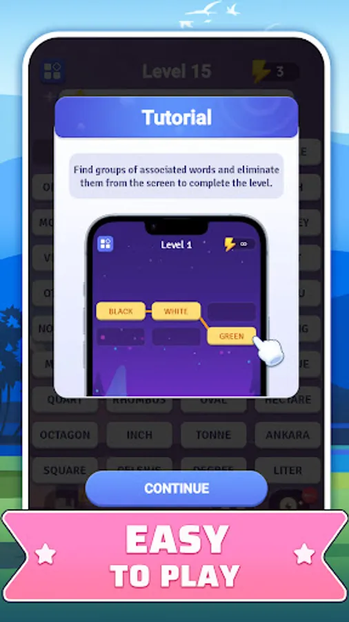 Simple & Intuitive iassociate Gameplay: Connect words of the same word associate theme in association word puzzle games. Unlike traditional word-finding games, Association Puzzle requires you to categorize words based on their themes and eliminate multiple associations juego de palabras words of the same category in associations juego de palabras.