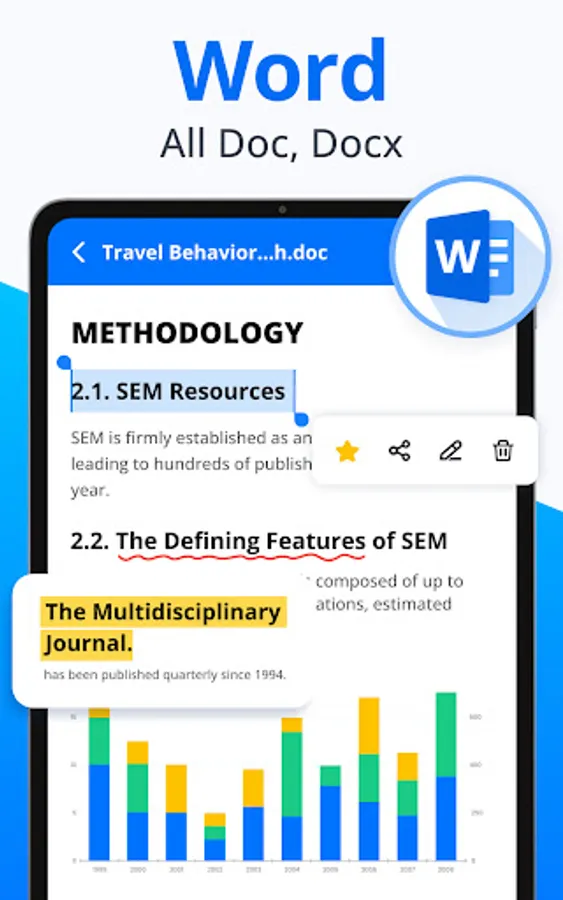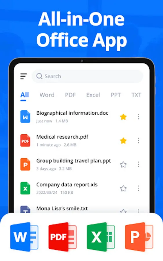 Docx Reader supports ultra-fast reading of all files, allowing you to read documents offline anytime, anywhere. It automatically scans and sorts the files on your device and displays them in one single place for quick access and management.