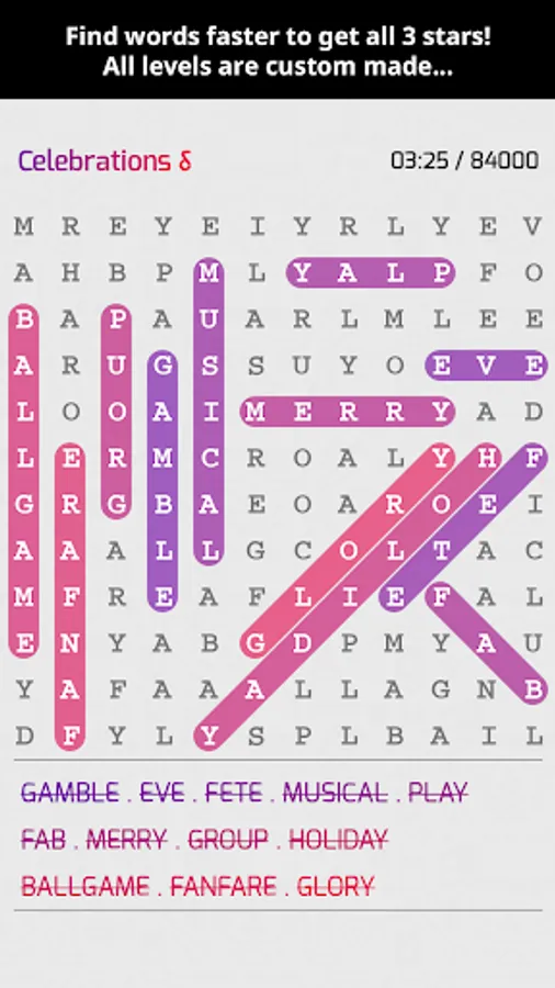Race with the time, search your words faster to win more and more gold stars.
