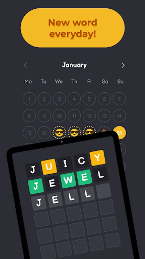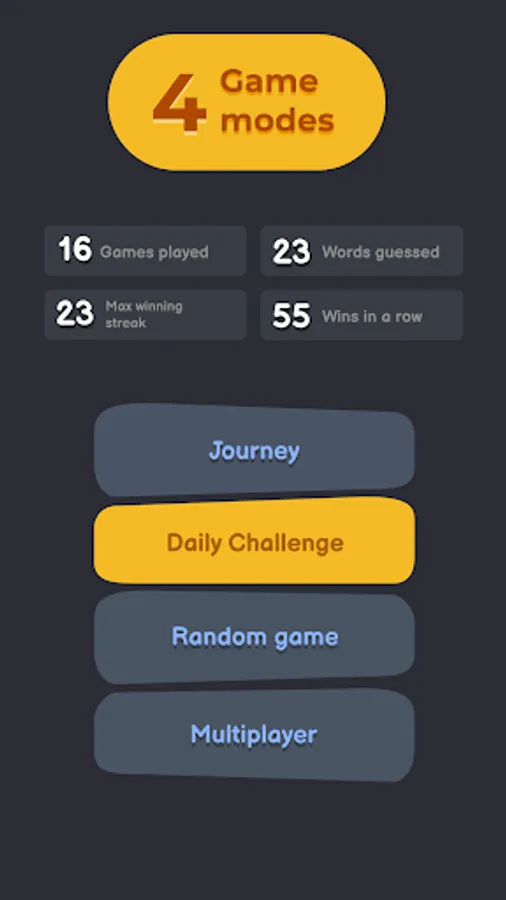1) Daily free word challenge. Guess a new word every day and compete with your friends in the number of guesses. You can discover new words every day or play with previous dates.
