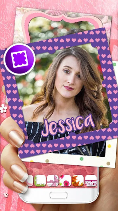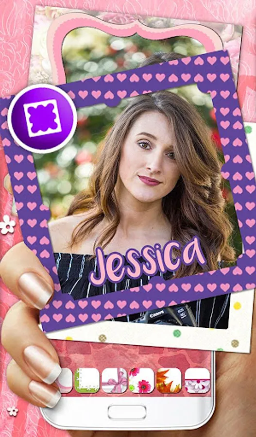 Select the frame, background pattern, layout, color, and font to add to pics.