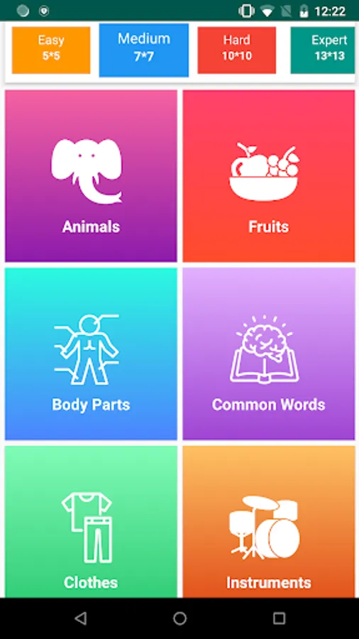 Easy: Perfect for little kids. The board is 5x5 so it's easy to find the words and solve the puzzle. In addition, the clue system helps you find a new word when the child is stuck.