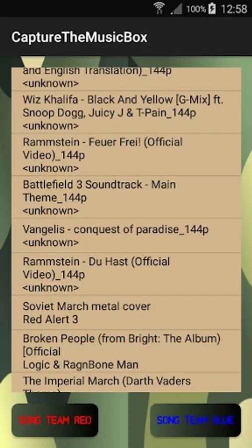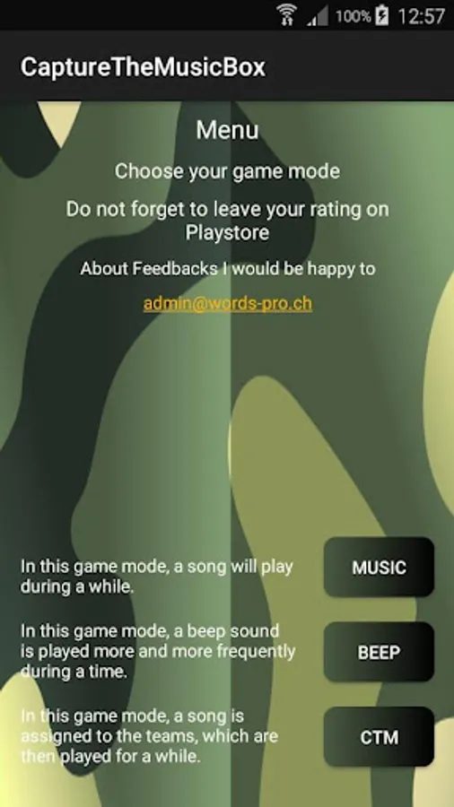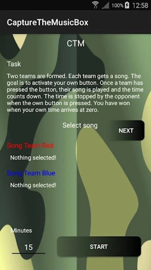 Type of game: Two teams are formed. Each team receives a song. The goal is to press the team button. After the team button has been activated, the song is played and the time counts down. If the team button is pressed by the other team, the time and the song are stopped. The team wins when time is zero.