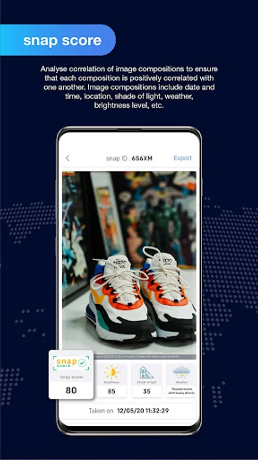 Users take relevant images through ‘snap’ application. Once captured, ‘snap’ will extract EXIF data from the image (i.e. identity), then analyse and verify the metadata for authenticity using our unique AI and machine learning technology.