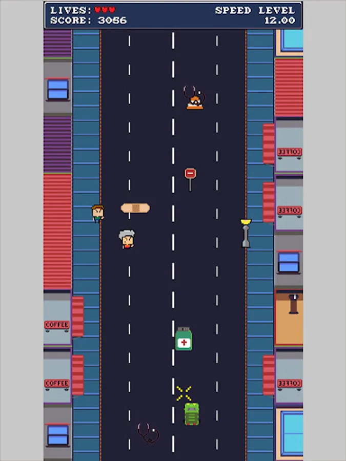 The patients are waiting - let's get going! Collect the items you need for care along the way to earn extra points. Get an extra life when you replenish your blood supply. But be careful - avoid oncoming traffic and other obstacles of daily traffic, we don't want to cause an accident.