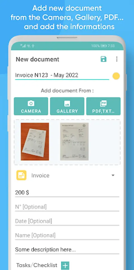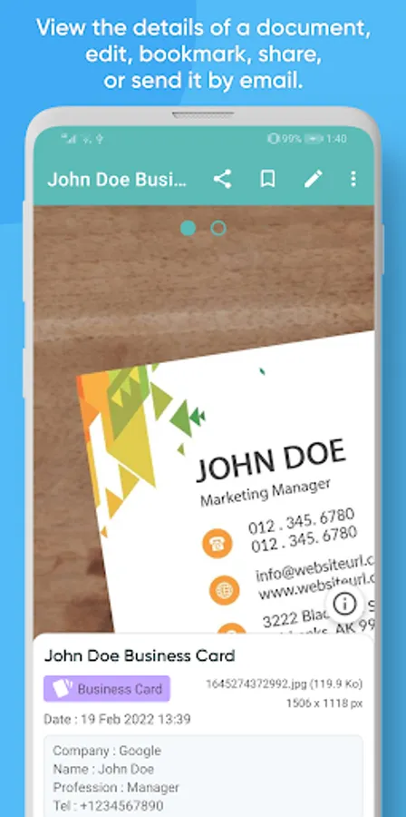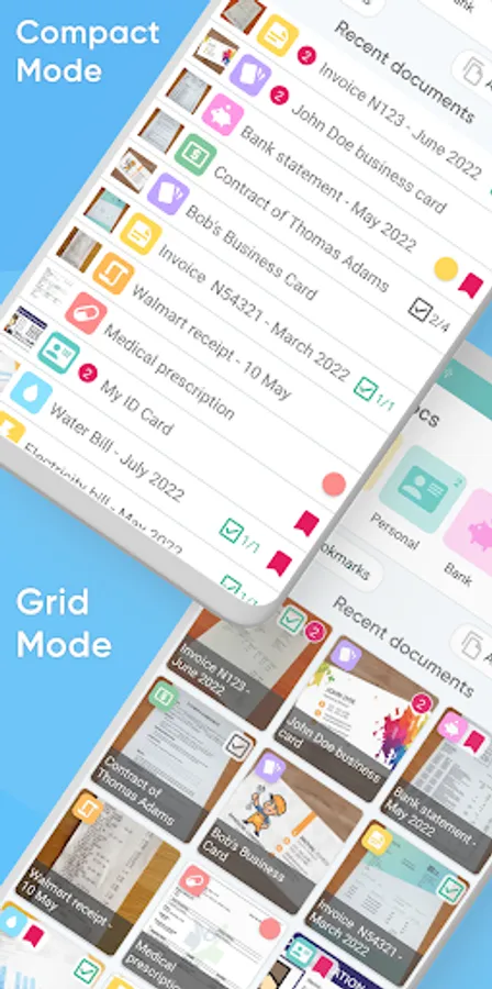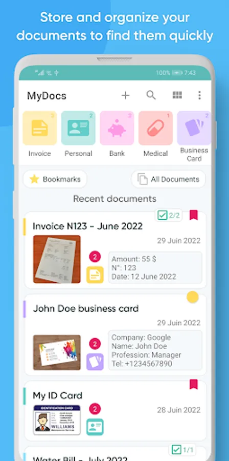 Take all your important documents with you wherever you go (invoices, personal documents, prescriptions, bank statement, business card, contracts...). You don’t have to look through a bunch of papers to find a document or important information. Just take pictures of your document with camera / scan and keep them on your phone in a well-organized way. This makes it possible to store, organize, archive, search documents, and retrieve them quickly even if you lose the original document.