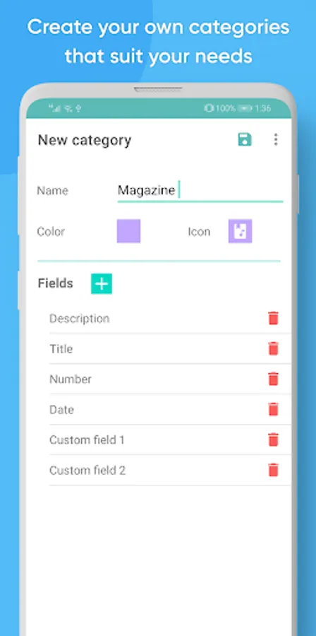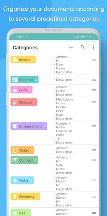 • Organize your documents according to several predefined categories: Invoice, Contract, Bank, Personal (e.g. identity card, etc.), Tickets (e.g. supermarket receipts...), Medicines (or prescriptions...), business card, book, water, electricity, gas bill, Product...