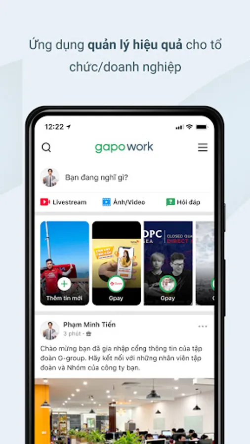 GapoWork is the first Vietnamese platform that allows businesses and organizations to create their own digital workplace. Not only providing a complete “digital office”, GapoWork creates a collaborative environment where each member can connect, be inspired, feel belonging and feel valued.