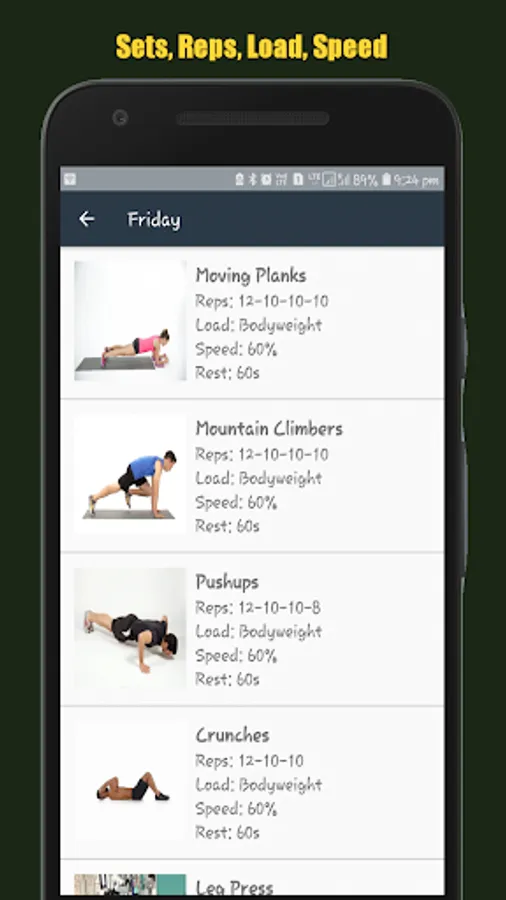 This app provides you detailed workout exercises of every part of body with structured set, reps, load, speed and rest.