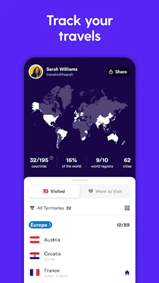 See your travel stats by world region and share your scratch map with friends