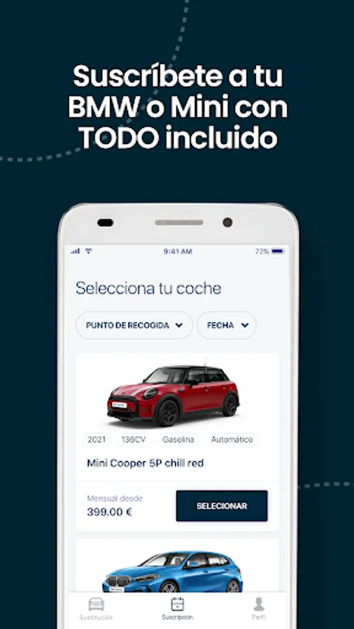 Choose the BMW or MINI you want, duration and mileage that best suits you and forget about unexpected expenses. Your subscription includes comprehensive insurance, roadside assistance, breakdowns and maintenance. The car you choose will be the one you take!