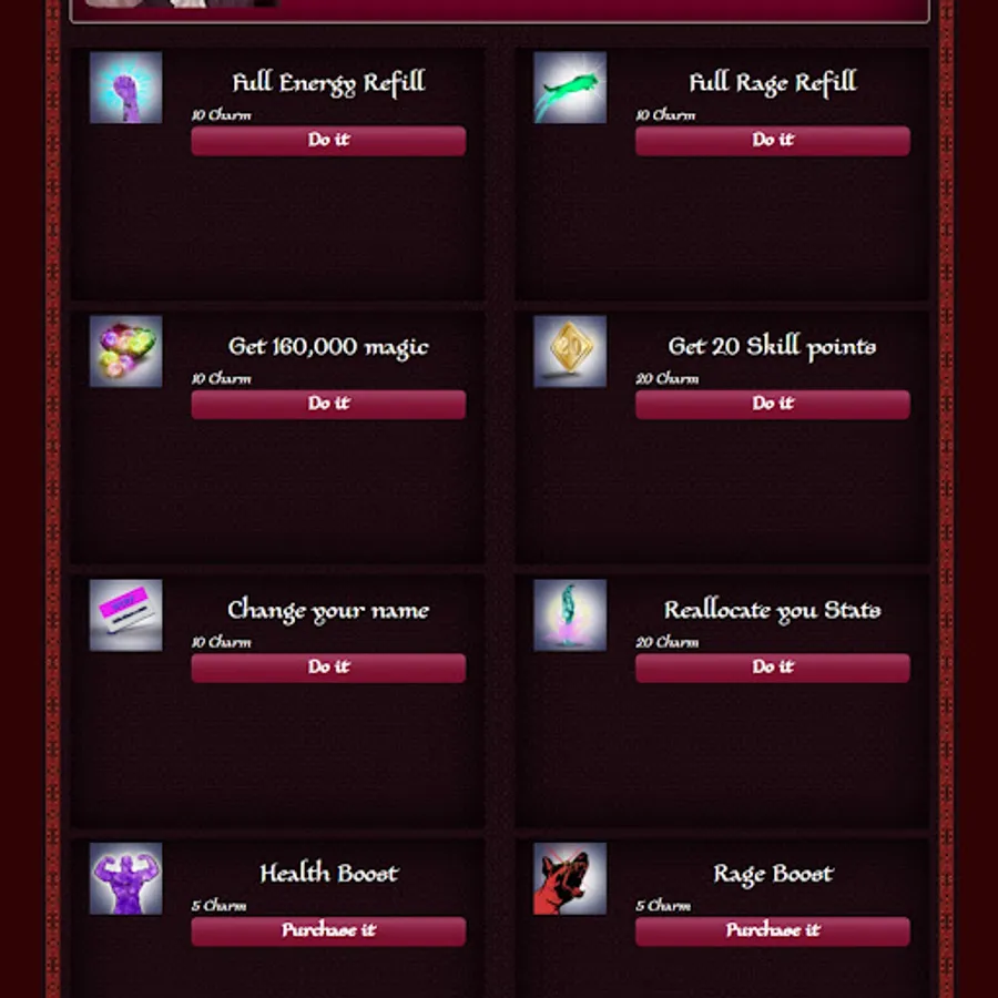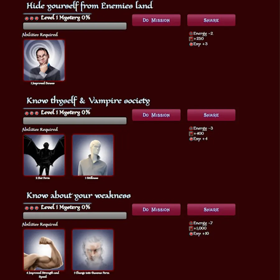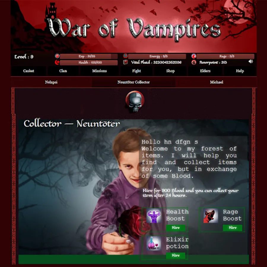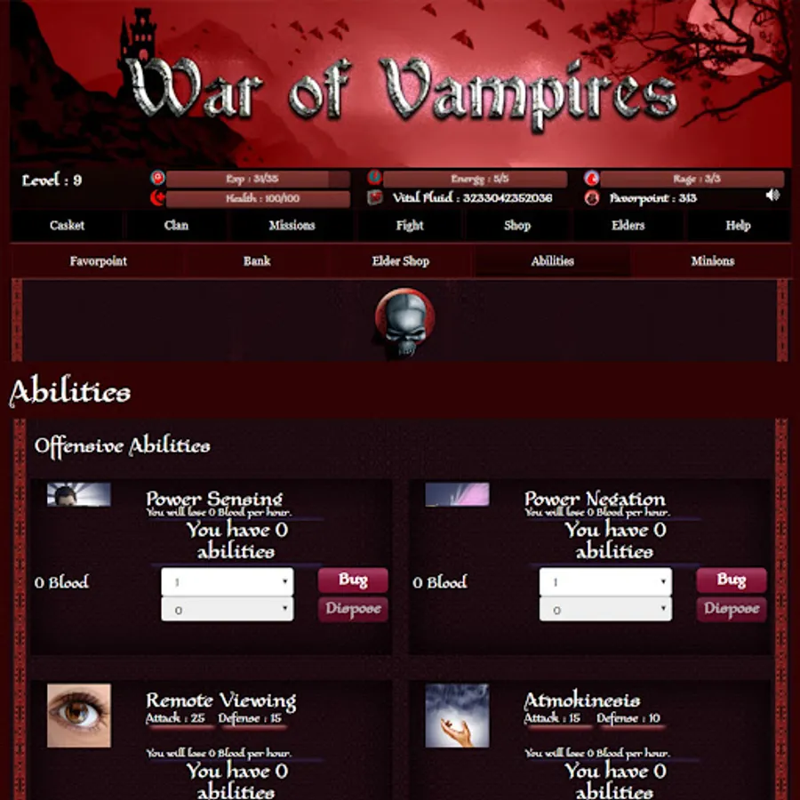 Fight with other powerful Vampires. Choose your opponent from the combat field and Fight! Remember, it will harm your health, not your energy. Winning a fight can help you gather experience