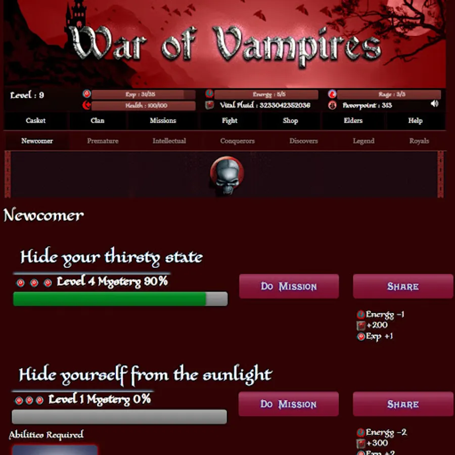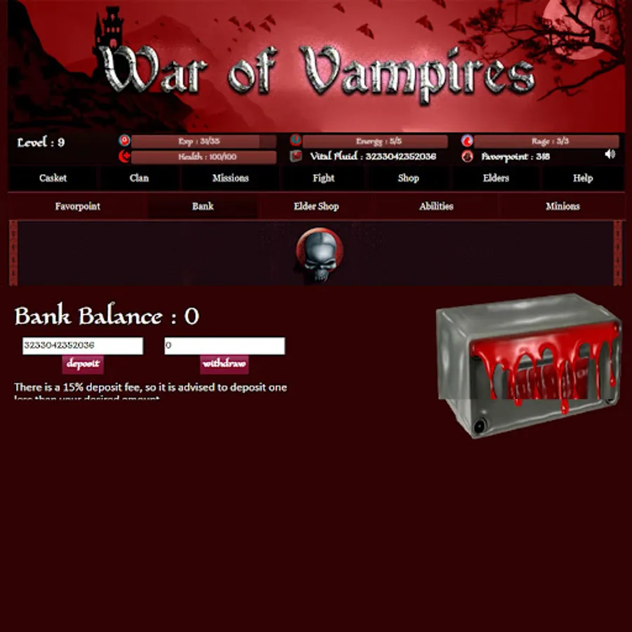 The coffin will give you complete information about your Vampire life. Here you can also be updated with your Blood flows and Elder’s information.