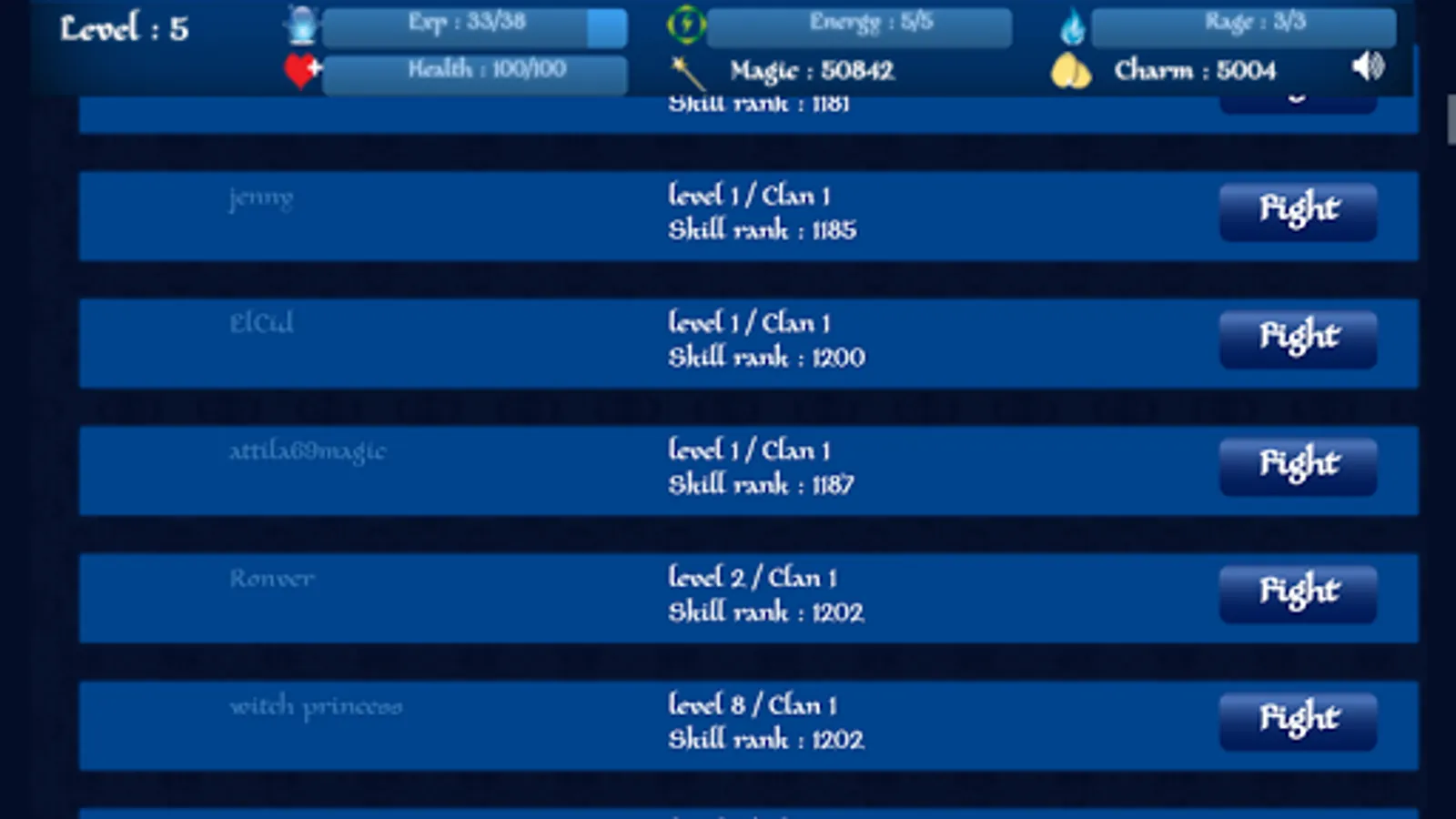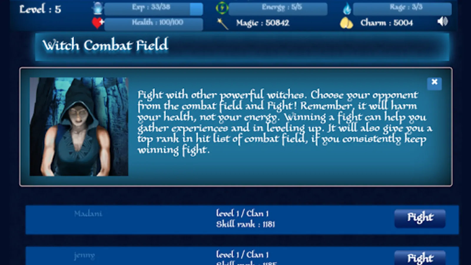 Fight with other powerful witches. Choose your opponent from the combat field and Fight! Remember, it will harm your health, not your energy. Winning a fight can help you gather experiences and in leveling up. It will also give you a top rank in hit list of combat field, if you consistently keep winning fight.