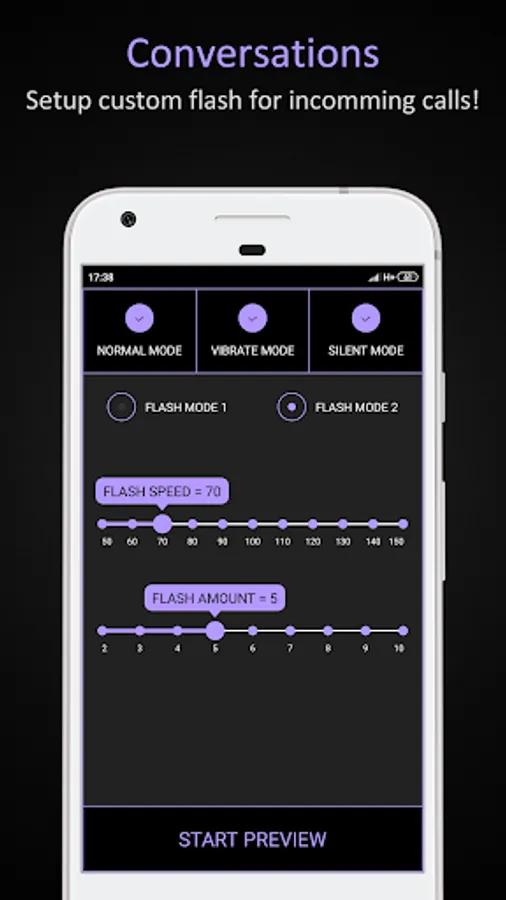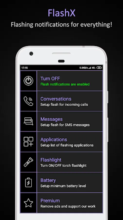 Get flashing alerts and notifications for all incoming phone calls, SMS messages or favorite chat, email or social media applications. FlashX will use your camera flash to create flashing light signals when phone ringing or new SMS message is received. You can setup flashing notifications for any favorite application installed on your device! Choose from two different flash blink modes for phone calls and fully customize your flash effect for both calls and messages. You can enable or disable flashing alerts for calls in normal, silent and vibrate mode. FlashX comes with simple and very handy flashlight feature build in! Select your favorite email, chat or social media app and start receiving flashing alerts for notifications coming from this apps. Make sure notifications access is allowed for FlashX from the device settings!