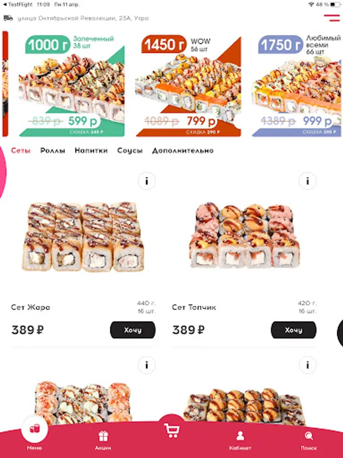 Order mouth-watering sets through our app with big discounts up to 70%! We will deliver within 60 minutes.