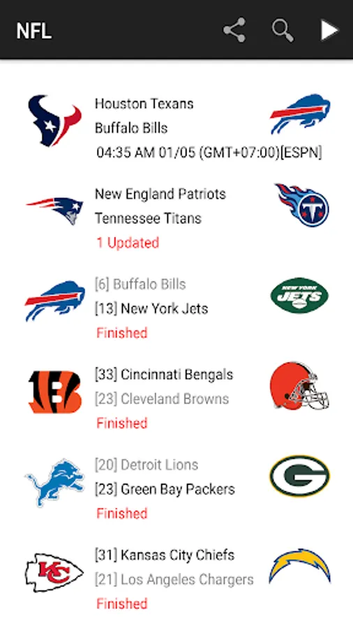 - Never miss live score of NFL Wild Card Round , NFL Divisional Round , NFL Conference Championships , Pro Bowl , Super Bowl.