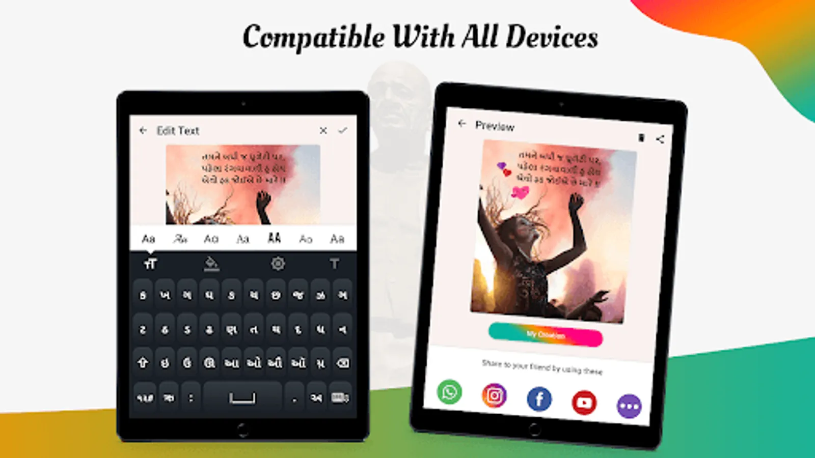 This application gives amazing functionalities to write words of yourself and share it with everyone. Nowadays everyone loves to post their photos to various social media accounts. This app gives the best opportunity to write texts, quotes or poetry on your photo in your own Gujarati language with its language keyboard.