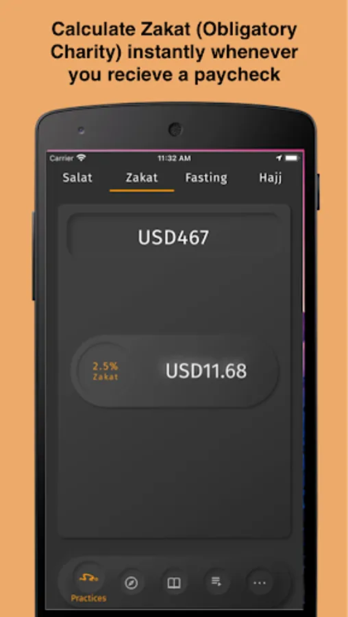 Just enter the amount of money you have earned and it will automatically calculate the amount of Obligatory Charity (Zakat) due on it (2.5%).