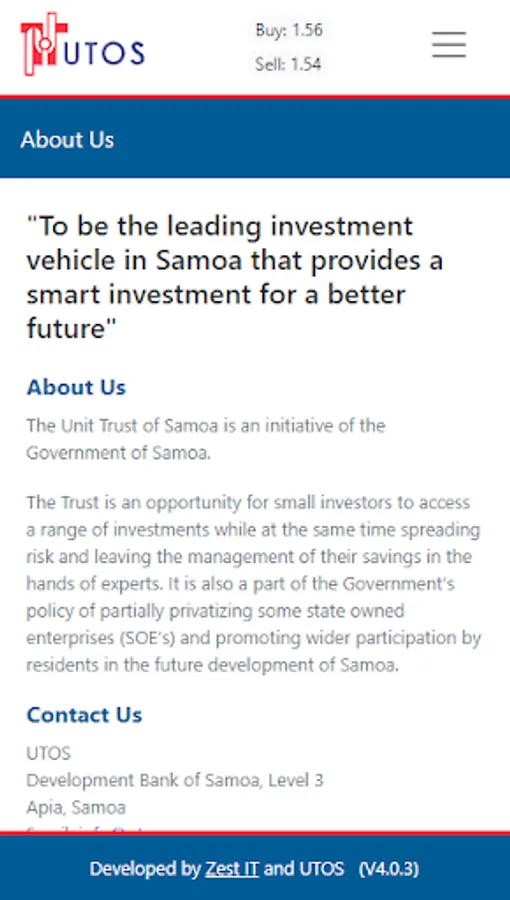 The Unit Trust of Samoa (UTOS) is an initiative of the Government of Samoa. The Trust is an opportunity for small investors to access a range of investments while at the same time spreading risk and leaving the management of their savings in the hands of experts. It is also a part of the Government’s policy of partially privatizing some state owned enterprises (SOE’s) and promoting wider participation by residents in the future development of Samoa.