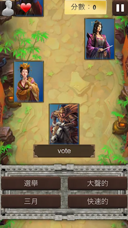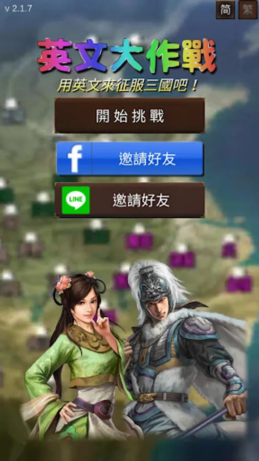 大家喜愛的三國志人物,讓你回到三國時代,利用你的英文技能,打倒群雄,稱霸三國時代,統一全國。