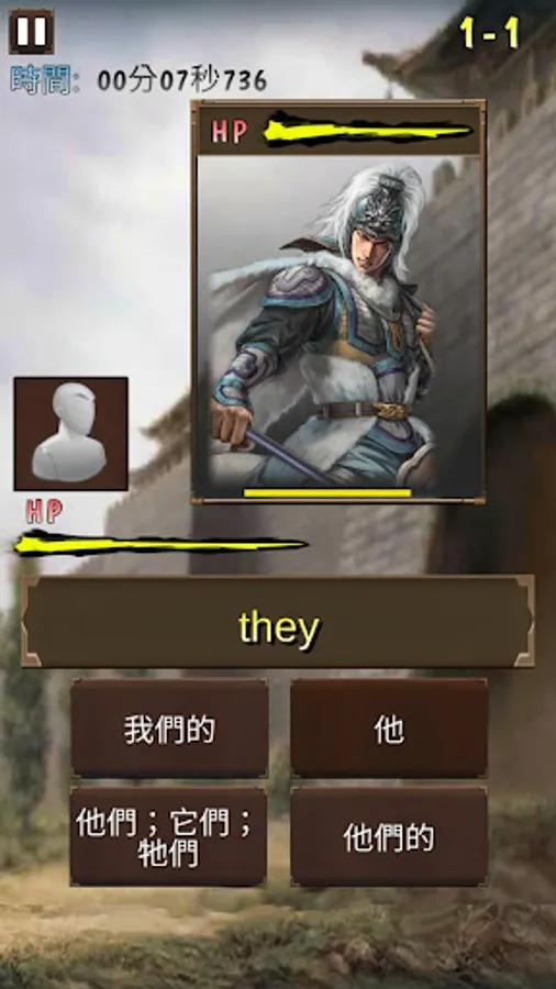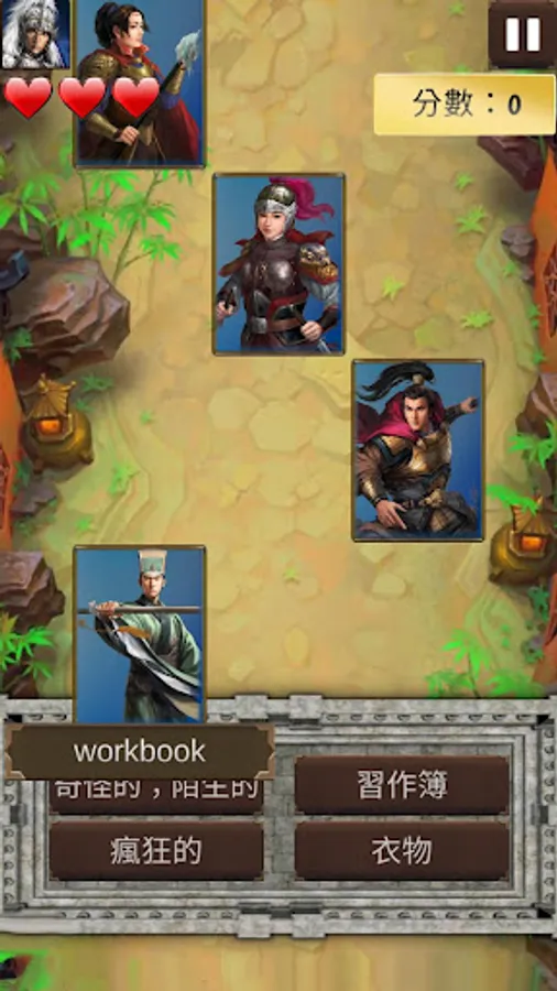 每一關皆會由一個武將把守,該武將會使用英文單字來阻擋你,單字數量就是該武將生命值,只要答對中翻英或者英翻中答案,