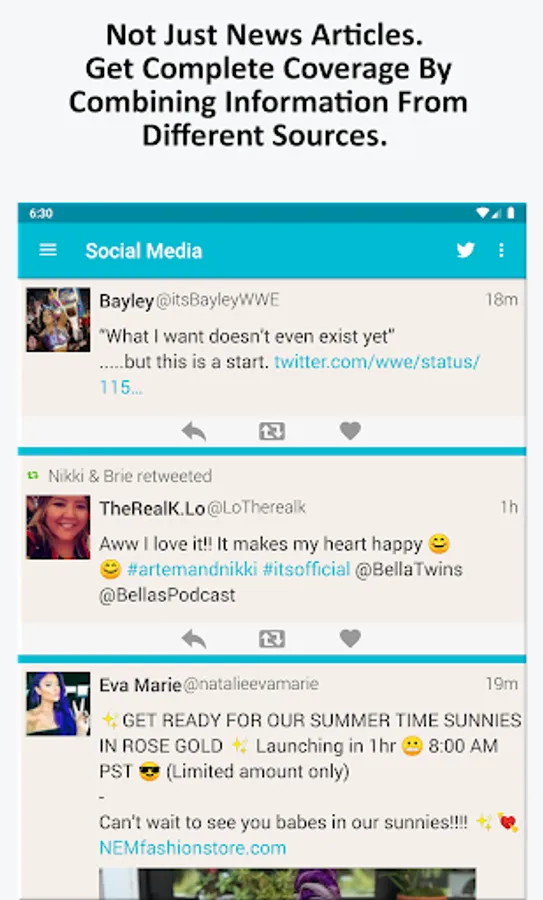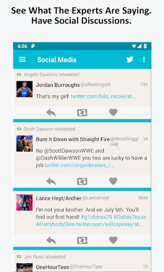 -- Discussion feed that aggregates wrestlers and personalities from the WWE world into a single list of tweets, so you can hear what everyone has to say and respond to them in real-time.
