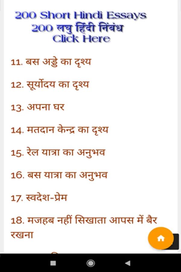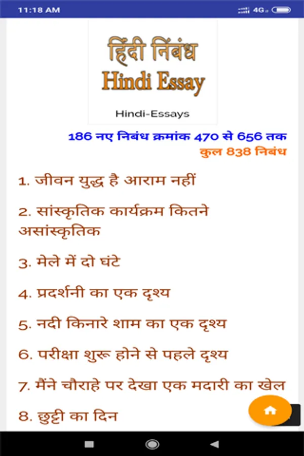 Welcome to “Hindi Essay” App, in this app Hindi Essays on various categories. Hindi Essay app is very simple and user friendly. User can read more than 500 Hindi Essays. All Essays in this app mainly divided in many categories:-