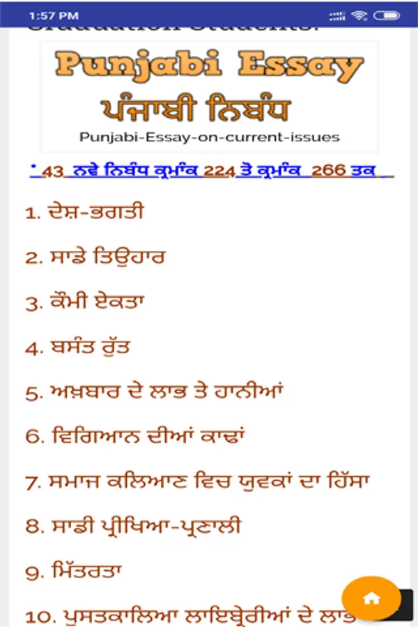 Welcome to "Punjabi Essays App" user can read hundreds of Punjabi Essays of various categories. App contains Punjabi Essays :-
