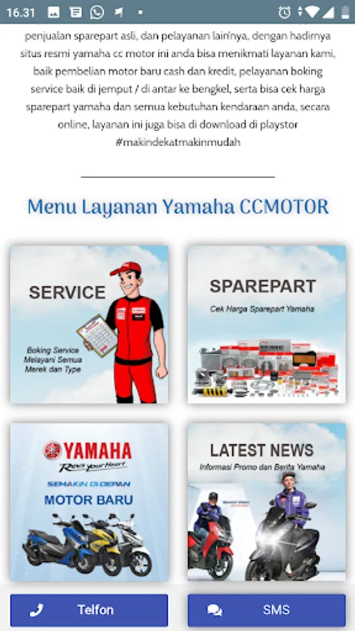 we are here to serve all your needs, both in the sale of new Yamaha motorbikes, service of all brands & types, sales of original spare parts, and other services, with the presence of the official Yamaha cc motorbike you can enjoy our services, both purchasing new cash motorcycles and credit, boking service services are either picked up / delivered to the workshop, and can check the prices of Yamaha spare parts and all your vehicle needs, online