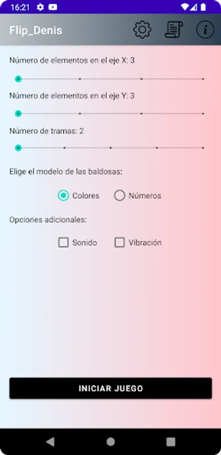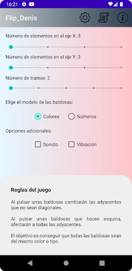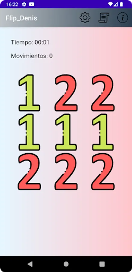 Welcome to our board game! Set up your game on the initial screen and get ready to face the challenge of leaving all the cells with the same content. Changing a cell will affect not only itself, but also all adjacent cells. And if the cell is in a corner, it will even affect the cell at its vertex! Can you make it? Download now and check it out!