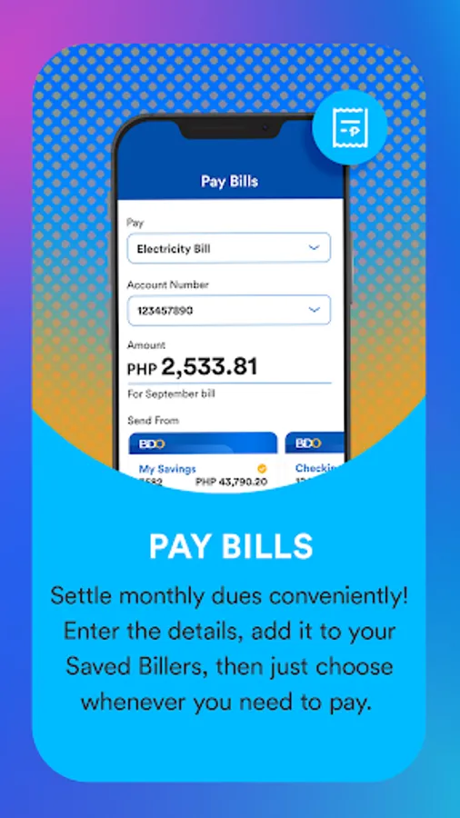 Send Money to other banks and mobile wallets in just a few taps. Just enter your receiver’s details, and Send Money straight from your linked BDO accounts.