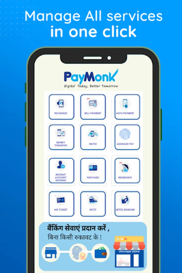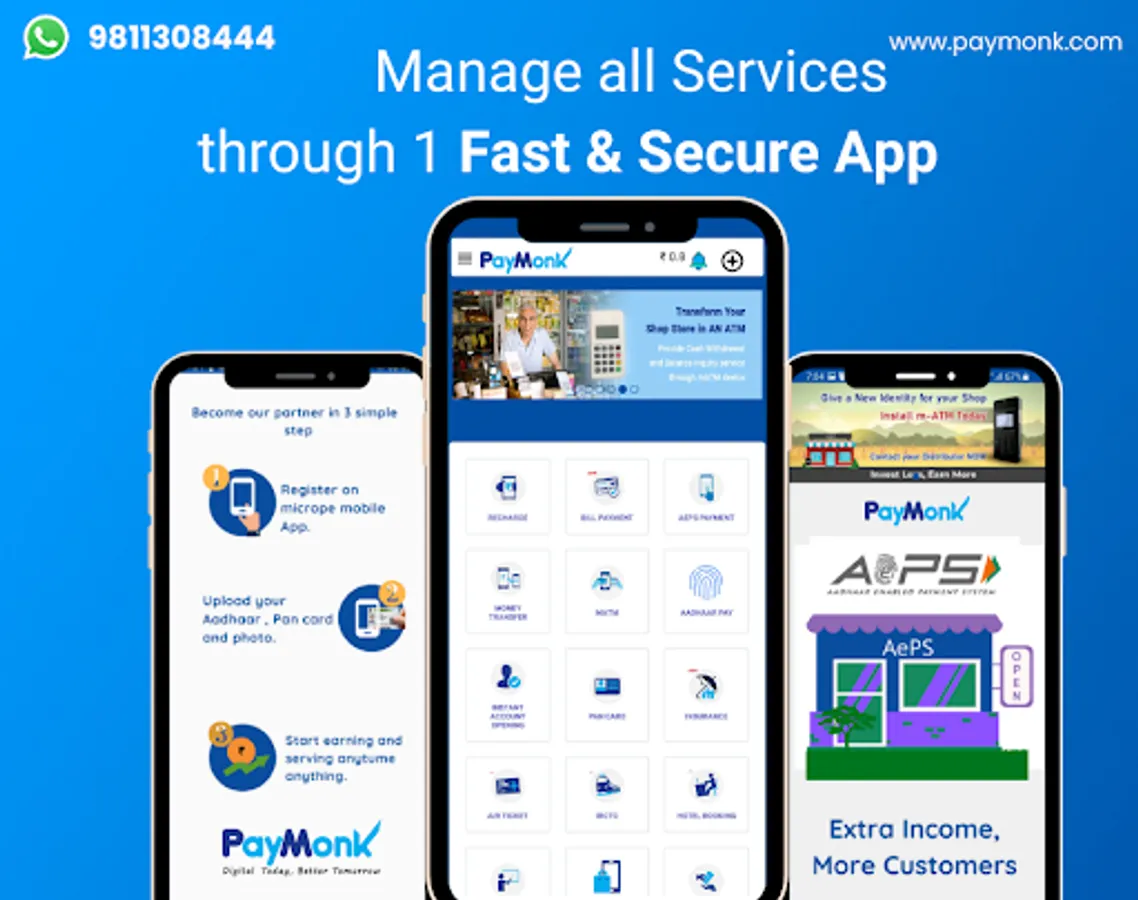 PayMonk microATM is used for AEPS, Bill Payments, Domestic Money Remittance, Recharges and many more services through agent assisted model.