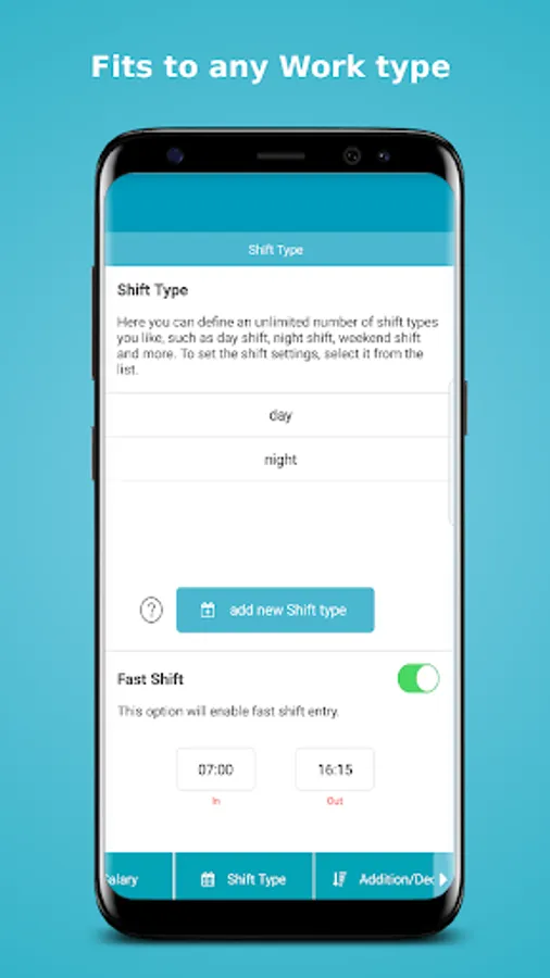 You can set individual monthly or daily Addition and Deduction. You can set a fixed break, unlimited Shift types and much much more by using a modern and beautiful UI design.