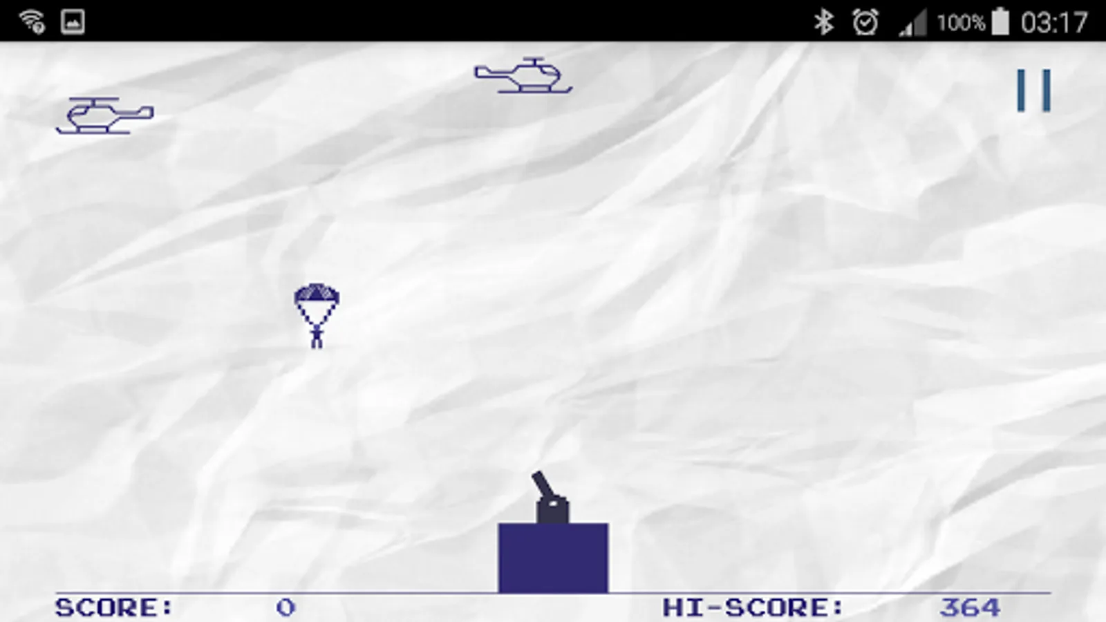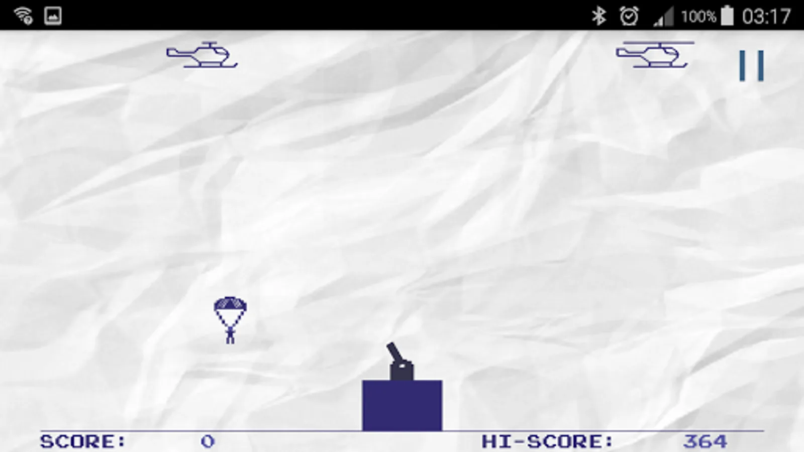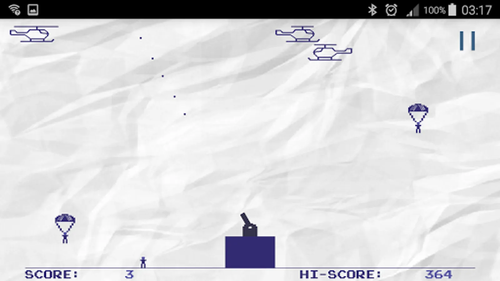 Helicopters fly across the screen at varying heights, dropping paratroopers. The gun may fire multiple shots at once, and the shots may destroy helicopters or shoot paratroopers.