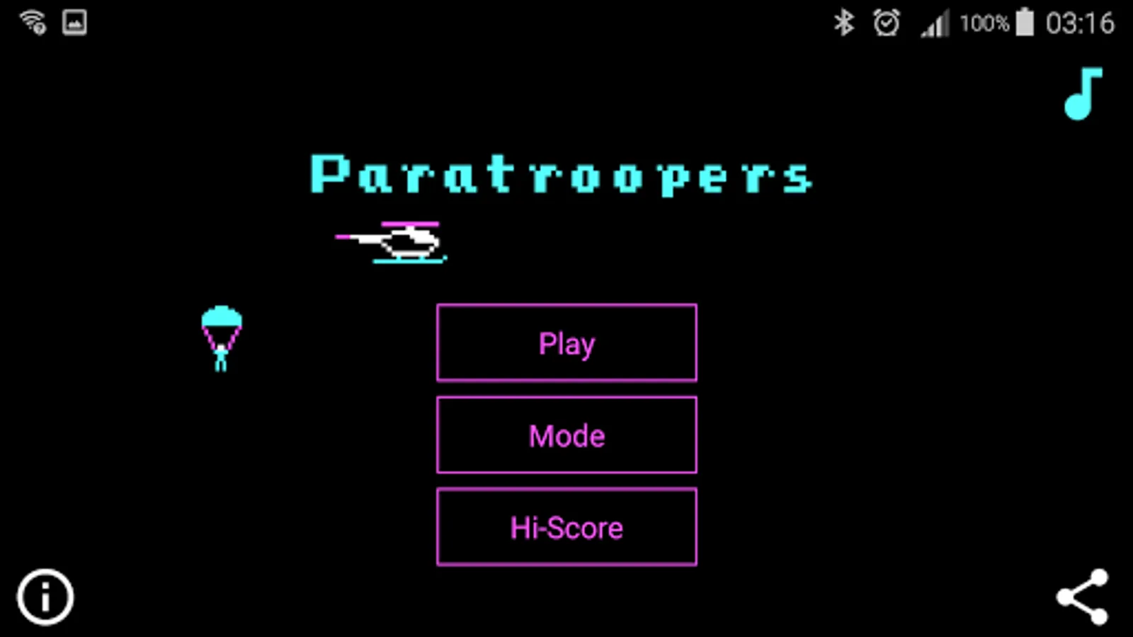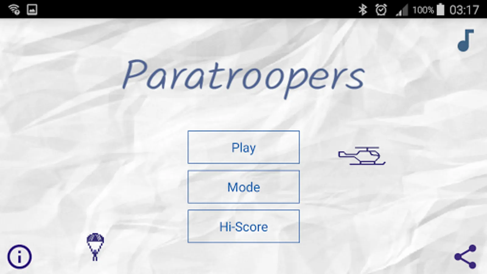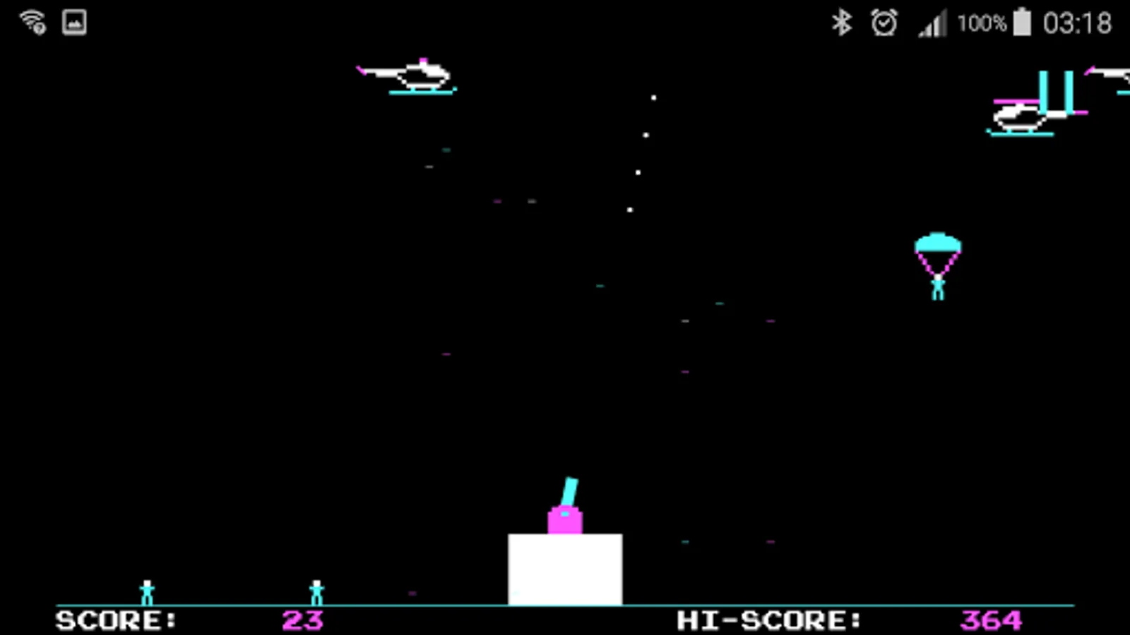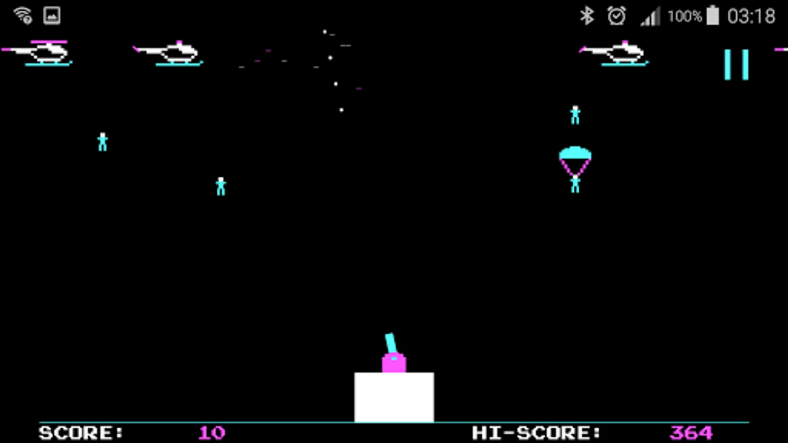 Helicopters fly across the screen at varying heights, dropping paratroopers. The gun may fire multiple shots at once, and the shots may destroy helicopters or shoot paratroopers.