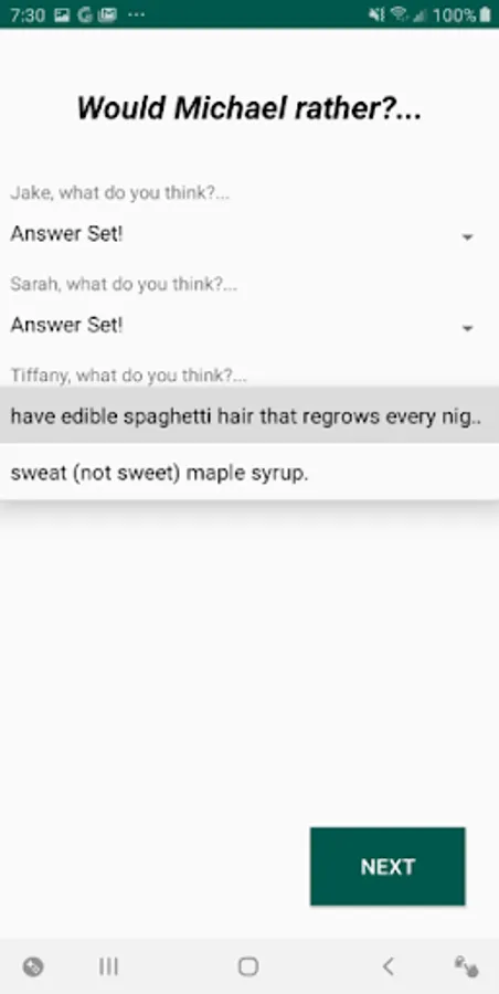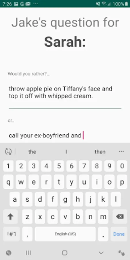 3. When that is done, the game starts and the app randomly selects one of the questions previously prepared to be displayed. The player whom the question was meant for now answers the question through the app without the other players seeing his/her answer.