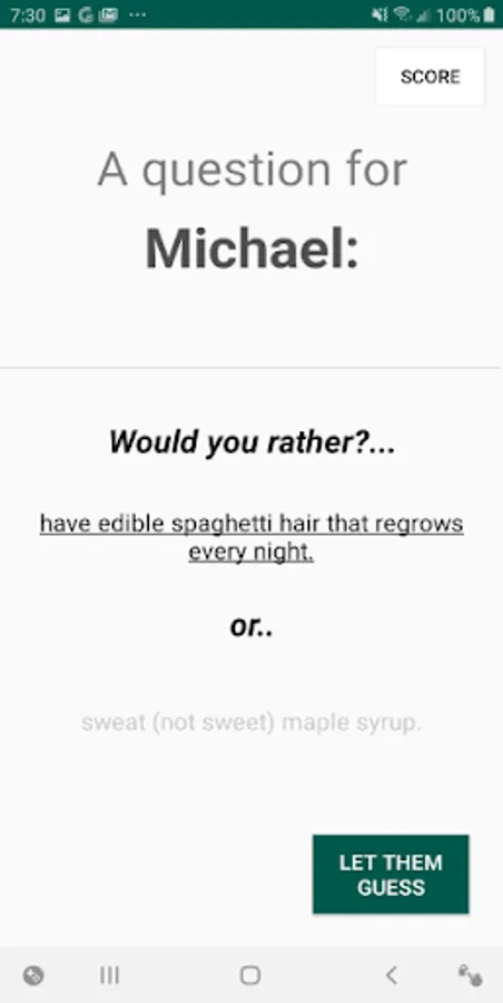 'Would You Rather (Unlimited)' is a clever spin on the classic game ('Would You Rather..?') and adds scoring and multiplayer options to make the game evermore fun to play. This way you can get to know your friends better by asking hilarious (intriguing and penetrating) questions while playing a challenging, amusing, though easy-going conversation & party game!