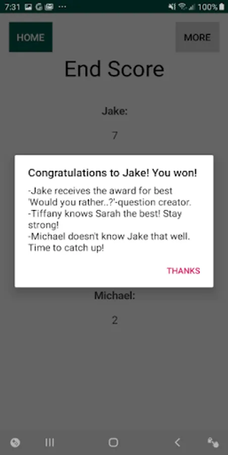 6. The app then shows an end screen with an end score and some additional amusing info derived from the played gamed (like who came up with the strongest questions and who knew who the best or the least).