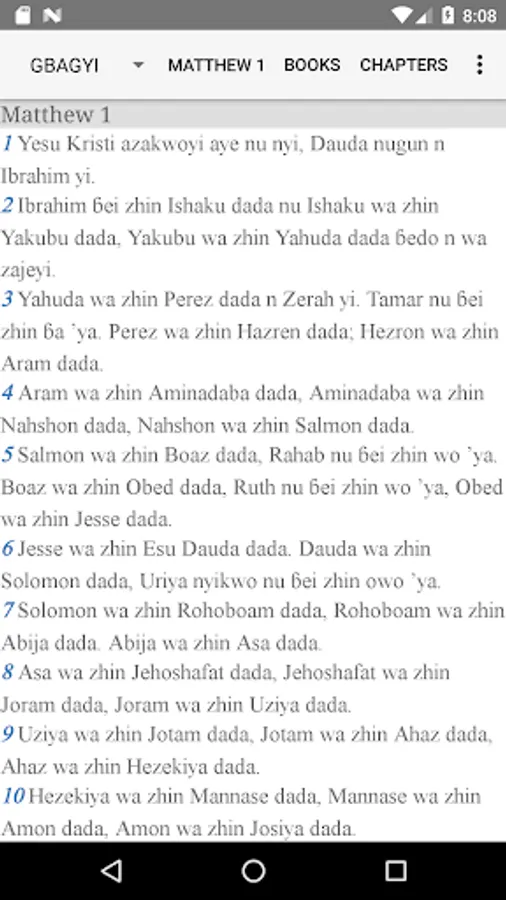 This is a Gbagyi new testament bible text which can be read using our bible reader application.