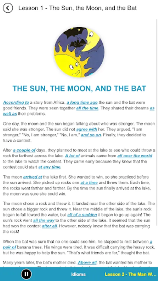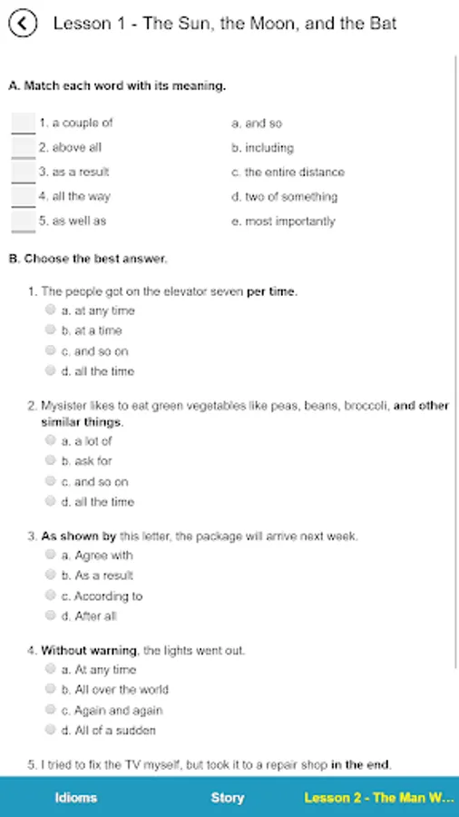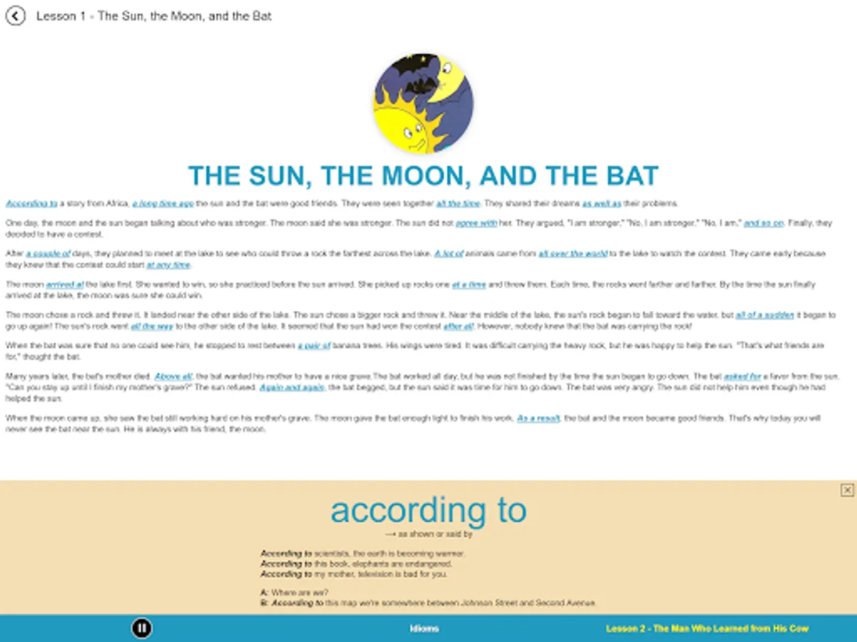Each lesson of this book begins with a list of twenty target idioms. The idioms are arranged alphabetically throughout the book to help students reference the idioms for later use. After completing all the units in the book, students may continue to use Illustrated Everyday Expressions with Stories series as a humorous illustrated dictionary of common idioms.